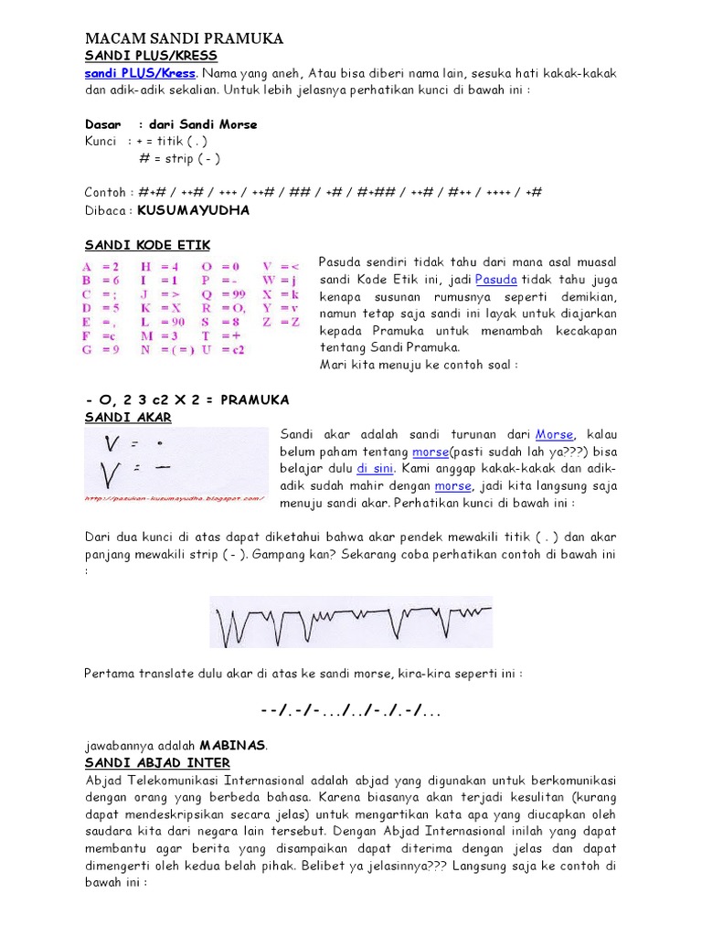 Sandi morse merupakan salah satu dari sekian jenis sandi di pramuka. Pertemuan besar penggalang ditingkat provinsi disebut. (4) sandi, semaphore, kompas, dan tali temali. Check spelling or type a new query. Berikut makalah contoh soal dan jawabannya search the world's information, including webpages, images, videos and more.